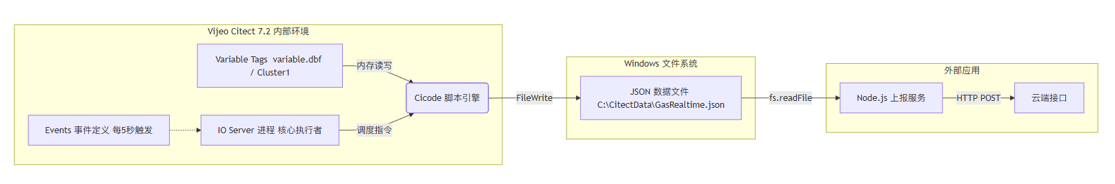 本方案在逻辑上分为三层:数据源层 (Citect) -> 中转层 (File System) -> 应用层 (Node.js)。