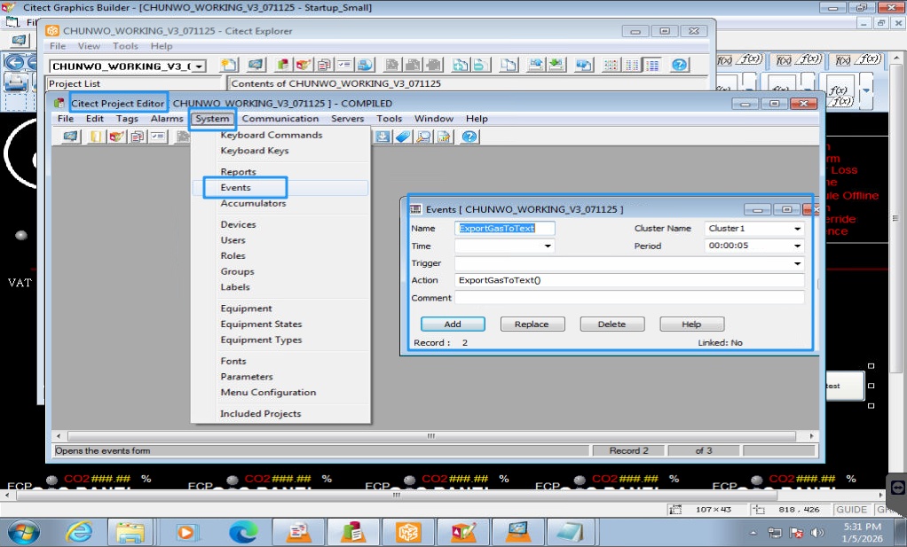 - 当前痛点:系统是一个封闭的 SCADA 环境。虽然界面(Panel 1 & Panel 2)能够显示 CO2、CH4 等气体的实时读数,但外部的 Node.js 上报服务 无法直接获取这些模拟量(Analog)数据,只能抓取文本报警日志。